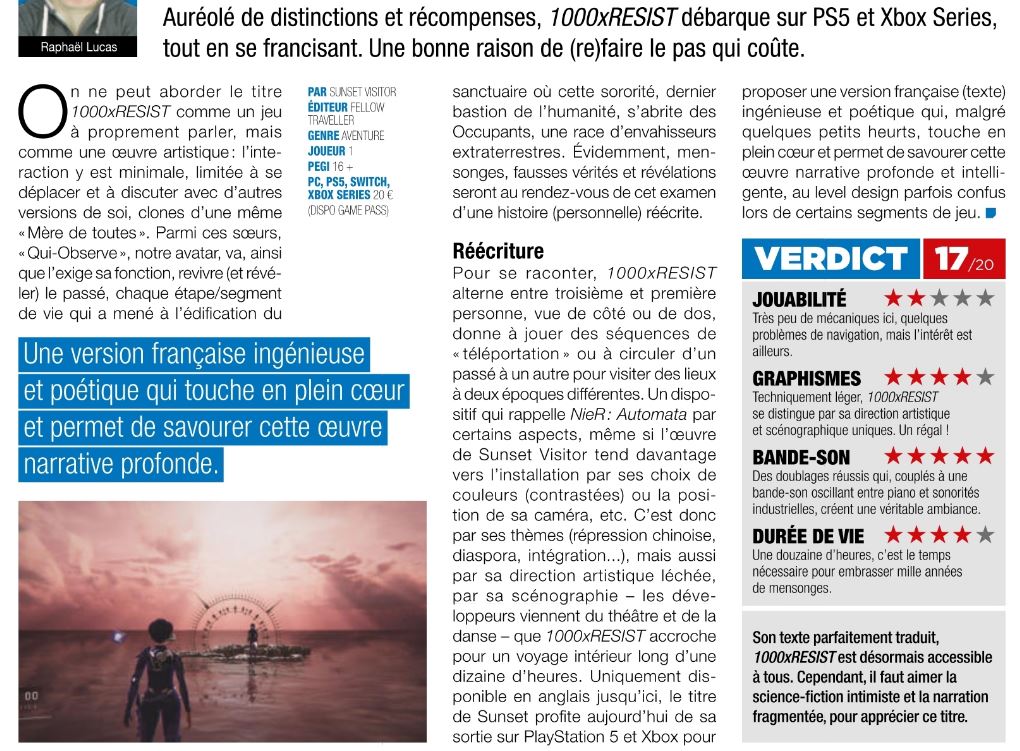 Développeur : sunset visitor 斜陽過客 Éditeur : Fellow Traveller Date de sortie: 9 mai 2024 (4 novembre 2025 en version française) Page Steam Sur le blog 04/11/2025 : Traduction - 1000xRESIST Ailleurs Jeux Vidéo Magazine, décembre 2025.
