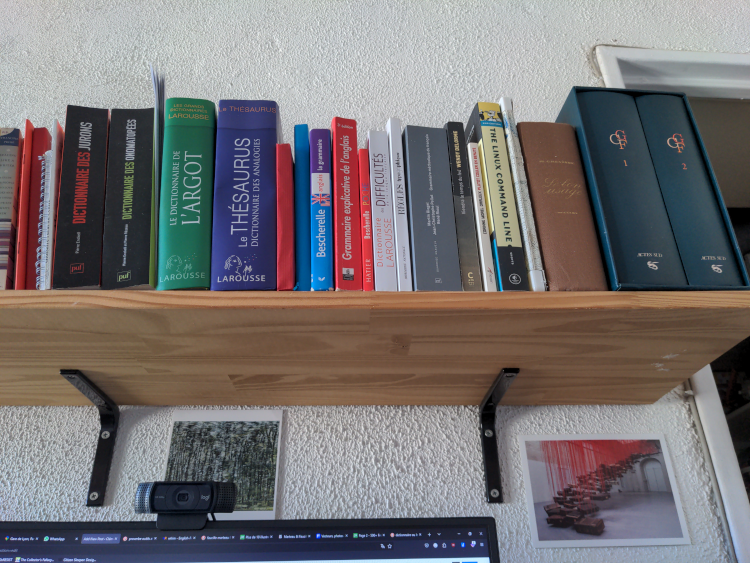 Je pourrais passer pas mal de temps à disserter sur les mérites de chacun de ceux dans l’image ci-dessus (non, il n’y a pas que des dictionnaires, oui, ça n’est pas très bien rangé, laissez-moi), ou bien à dire tout mon amour du Thésaurus de Larousse, qui n’est PAS un dictionnaire de synonymes. Je me contenterai de dire que ce sont des outils essentiels… auquel je n’ai pas si souvent recours parce que la plupart du temps, mes multiples dictionnaires en ligne me suffisent. Pêle-mêle :